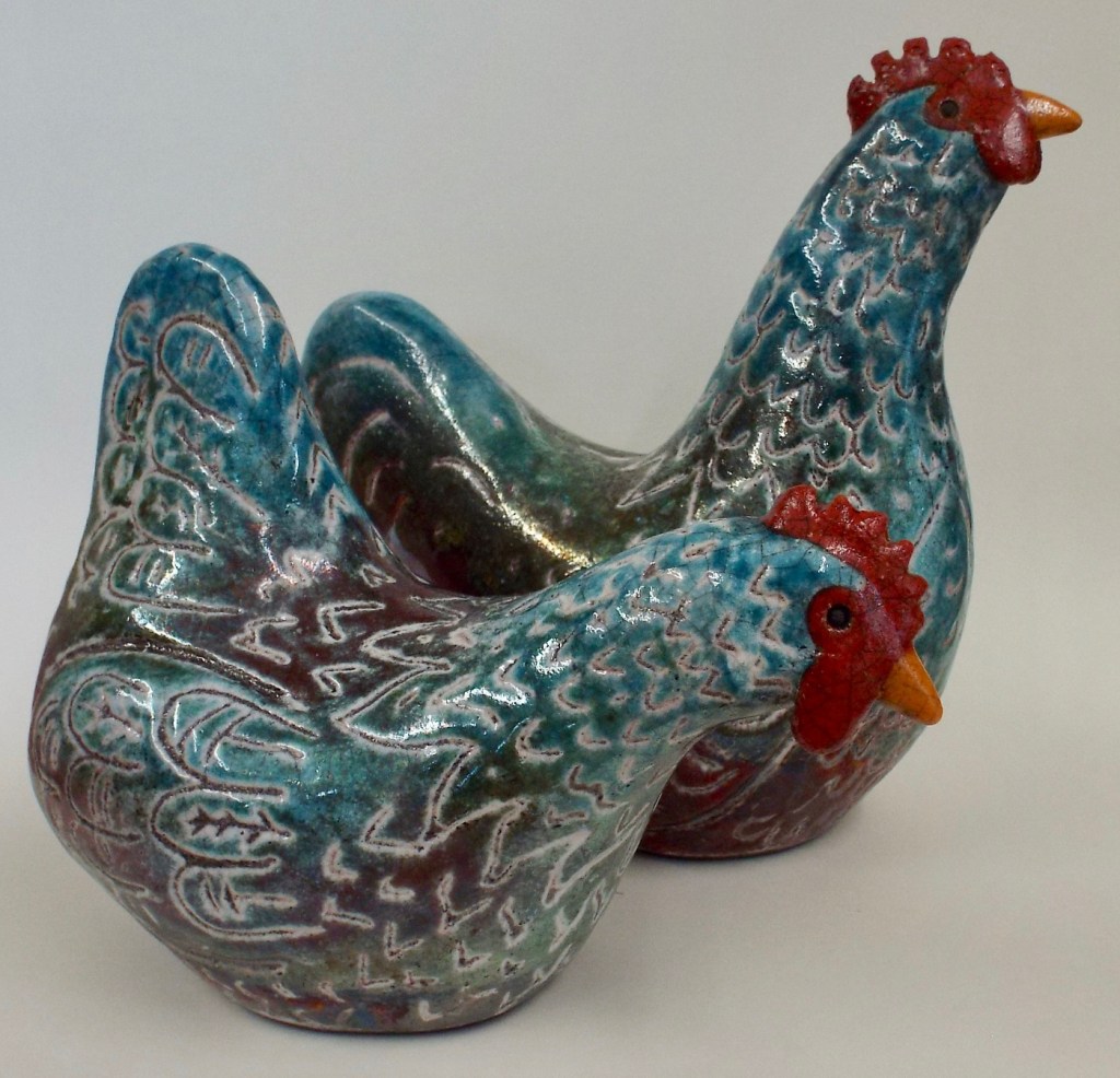I make a range of domestic-ware, including chicken eggcups, jugs, bowls, coffee cups, mugs and plates. These come in several finishes, such as; high-fired glaze painted slipper a rich vibrant blue with subtle variations from the kiln firing.