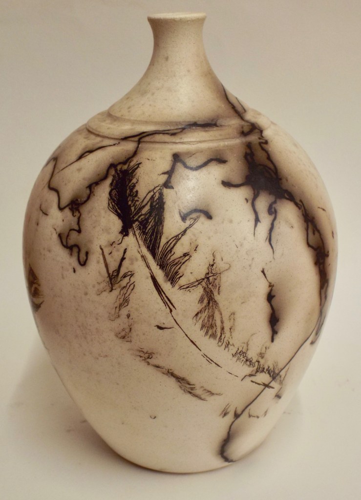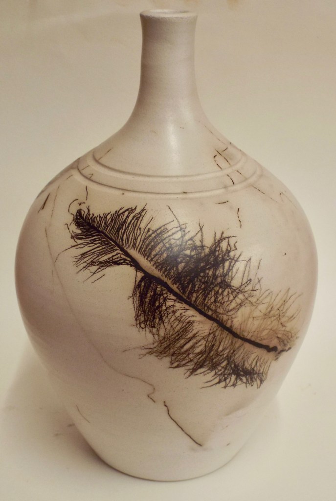 I make one-off burnished pieces (mainly vase) which are slip decorated, burnished, lustered, smoked and then polished. These pieces are unglazed and display a tactile eggshell surface quality, beneath of which lies a wispy smokiness.