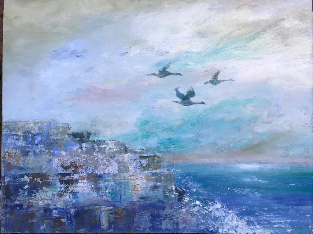 On Thursday 27 March I attended an enjoyable six-hour workshop at The West Barn in Bradford on Avon taught by Melissa Wishart. The subject was Painting Light on Water in oils or acrylics. I was quite pleased with my two seascape canvases in oils but felt they needed something extra such as a few birds or a yacht. As I was using oils I was unable to add the fine details until the paintings are dry . . . and when I can make time!