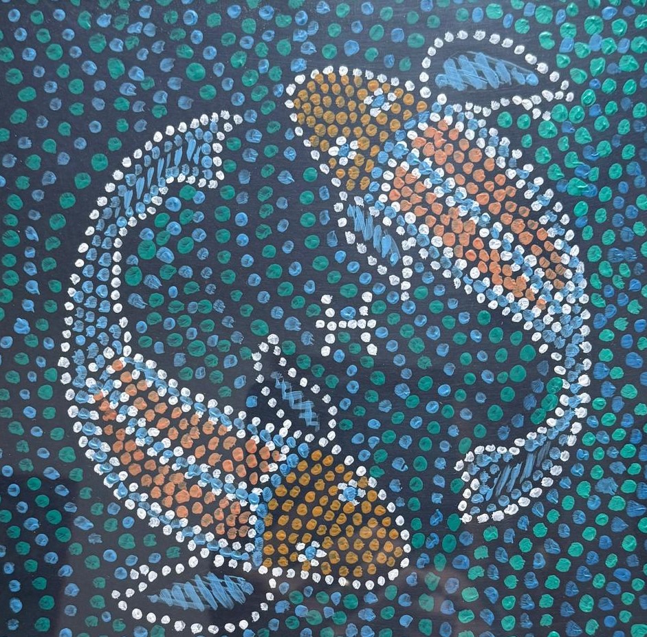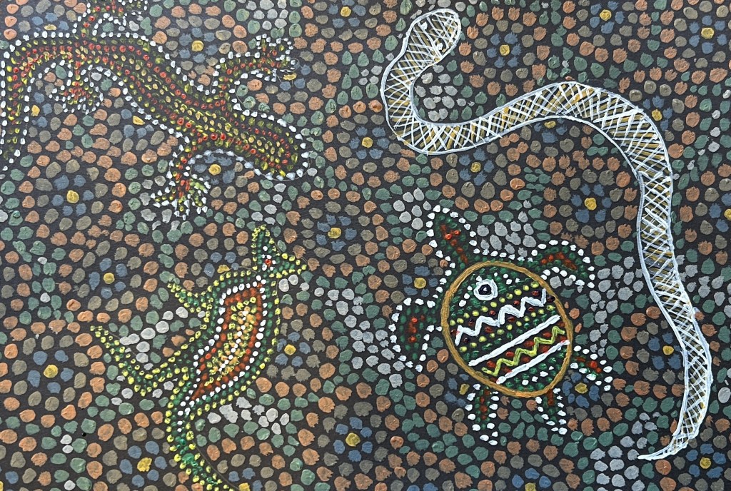 On Wednesday 5 March, I ran a free in-house art workshop at Chilcompton Art Club where I normally paint for myself. Occasionally some members offer to do a free workshop and on this occasion I offered “How to Paint a Picture in the style of Australian Indigenous Art. I took in lots of inspirational photographs featuring the typical dot paintings and other styles. Members could use acrylics, gouache or saturated watercolours to create their own designs on black card in any colours they wished. I also gave them instruction sheets, a page of typical symbols and I read to them while they worked, explaining more about the background to the aboriginal art story.